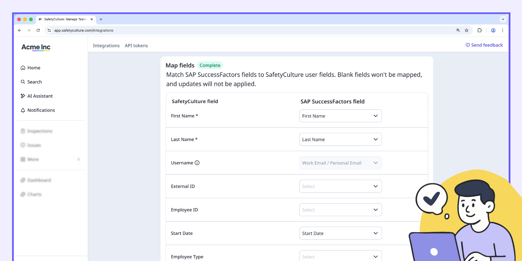 Choose which SAP SuccessFactors fields map to SafetyCulture user fields. Mapped fields are updated by sync.
