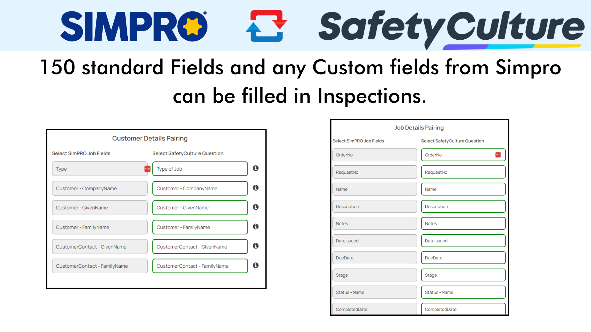 You control which Simpro fields sync into which SafetyCulture inspection questions. Only paired fields sync. At least one field pairing is required to enable the sync of PDF reports back into Simpro. For compatibility, all mapped SafetyCulture fields must use the “Text Answer” type and have exact name matches.